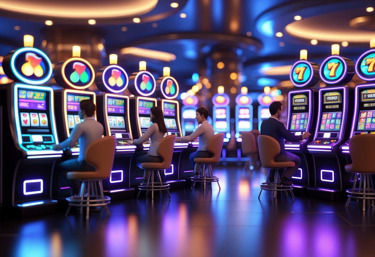 Area kasino dengan beberapa mesin slot berwarna-warni dan orang-orang yang bermain dengan fokus dan senang.